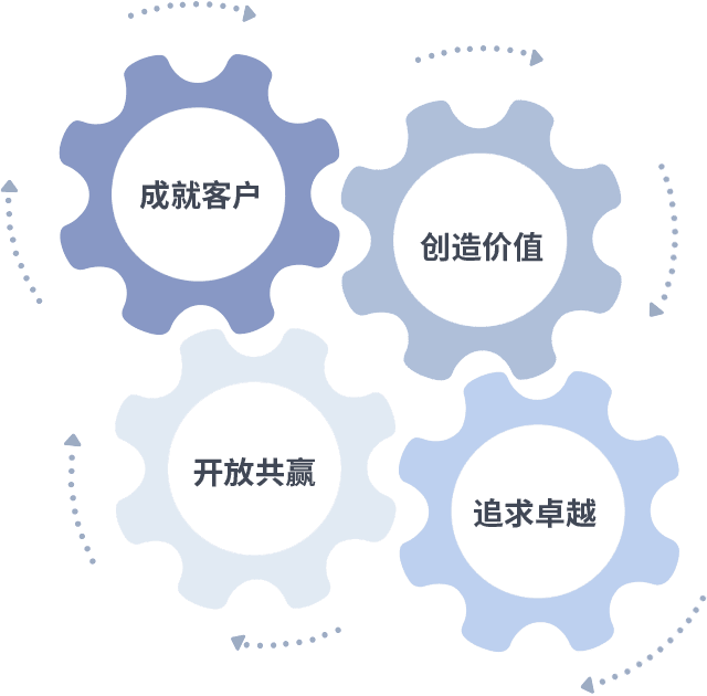 成就客户是一切决策的出发点,,创造价值是衡量所有工作的标准,,追求卓越是我们做事做人的态度,,,,开放共赢是我们的格局也是最终的结果。。。。价值观的齿轮环环相扣,,推动着组织里的每个人不断向前。。