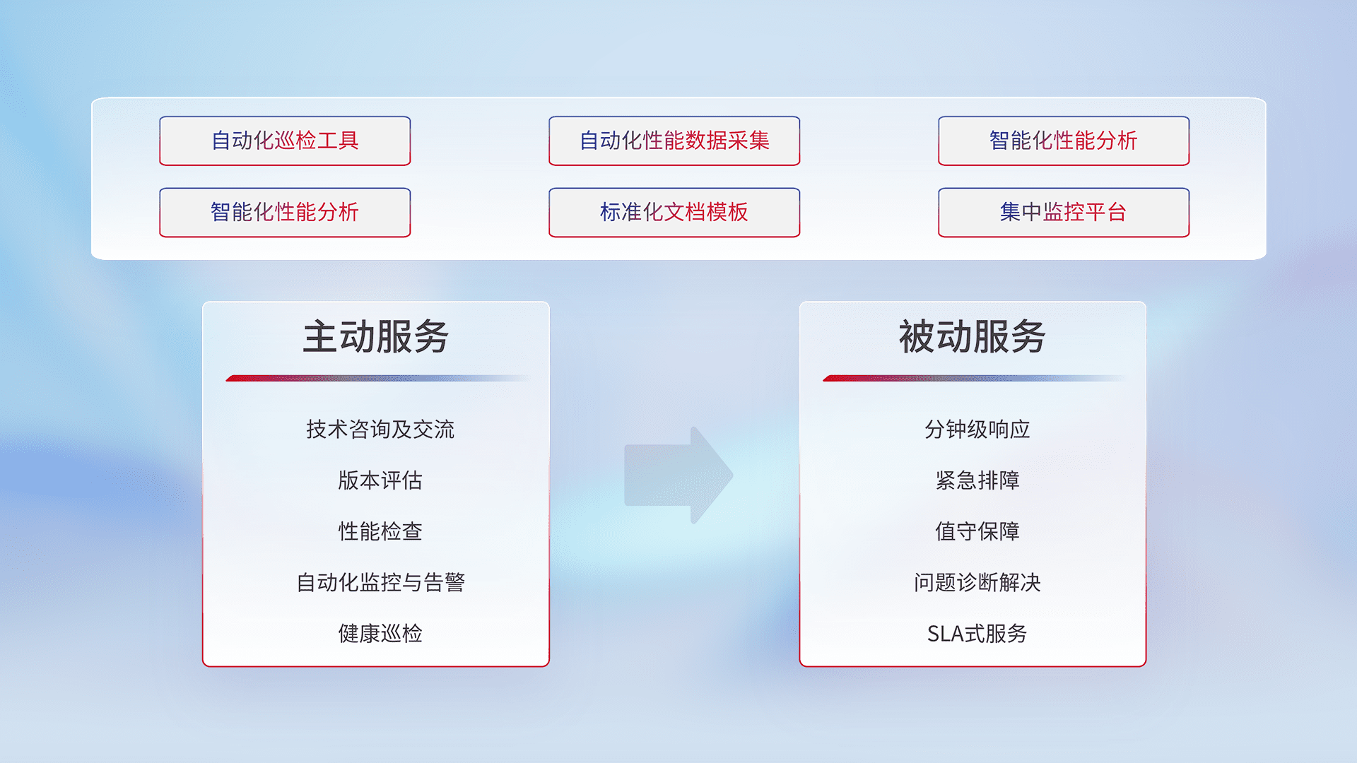 智能化工具和标准化文档,,,保障服务质量,,,,提供主动服务(包含技术咨询、、、版本评估、、性能检查、、、自动化监控与告警、、、健康巡检)和被动服务包含(分钟级响应、、、紧急排障、、、、值守保障、、、、问题诊断解决、、、SLA服务)。。。。